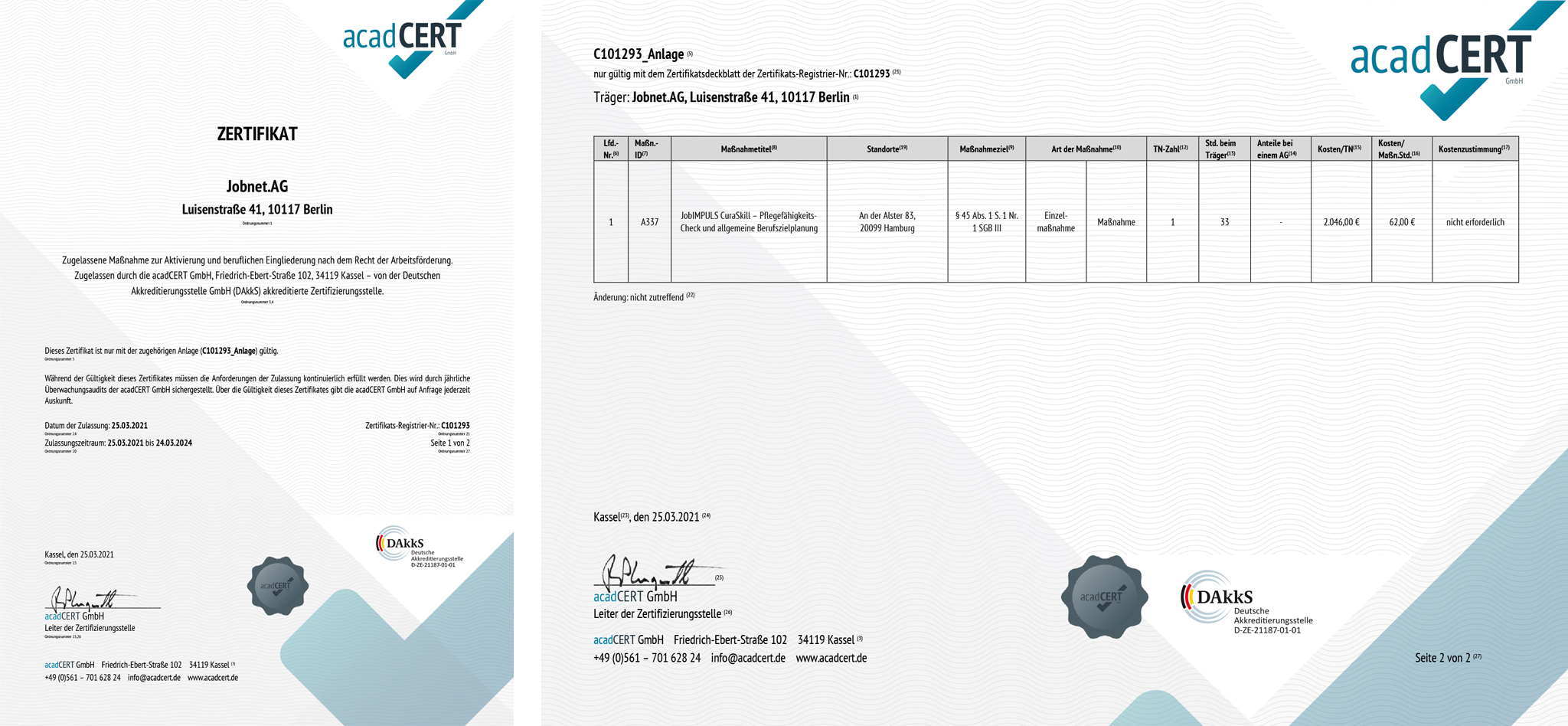 Im Rahmen von JobIMPULS CuraSkill kann auch die eingebaute, sichere Videoplattform Jobnet.LIVE genutzt werden. Jobnet.LIVE ist von der datenschutz cert GmbH in Bremen (www.datenschutz-cert.de) nach dem ips-Standard (internet privacy standard) zertifiziert worden, speziell auch für den Einsatz im Sozialbereich.
